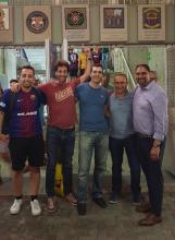 Penya Blaugrana London members saluted the PBL badge at Camp Nou before it gets taken down temporarily before the building works start for the new Camp Nou